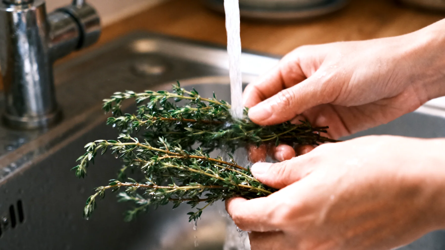 Ein trocken gereinigter Thymian, etwa durch Bürsten, entfernt sichtbare Partikel, aber nicht die unsichtbaren Biofilme, die sich im Freien schnell bilden können. Daher ist der kurze Kontakt mit Wasser eine sinnvolle Maßnahme, nur muss er so kontrolliert erfolgen, dass das ätherische Gleichgewicht bestehen bleibt.
