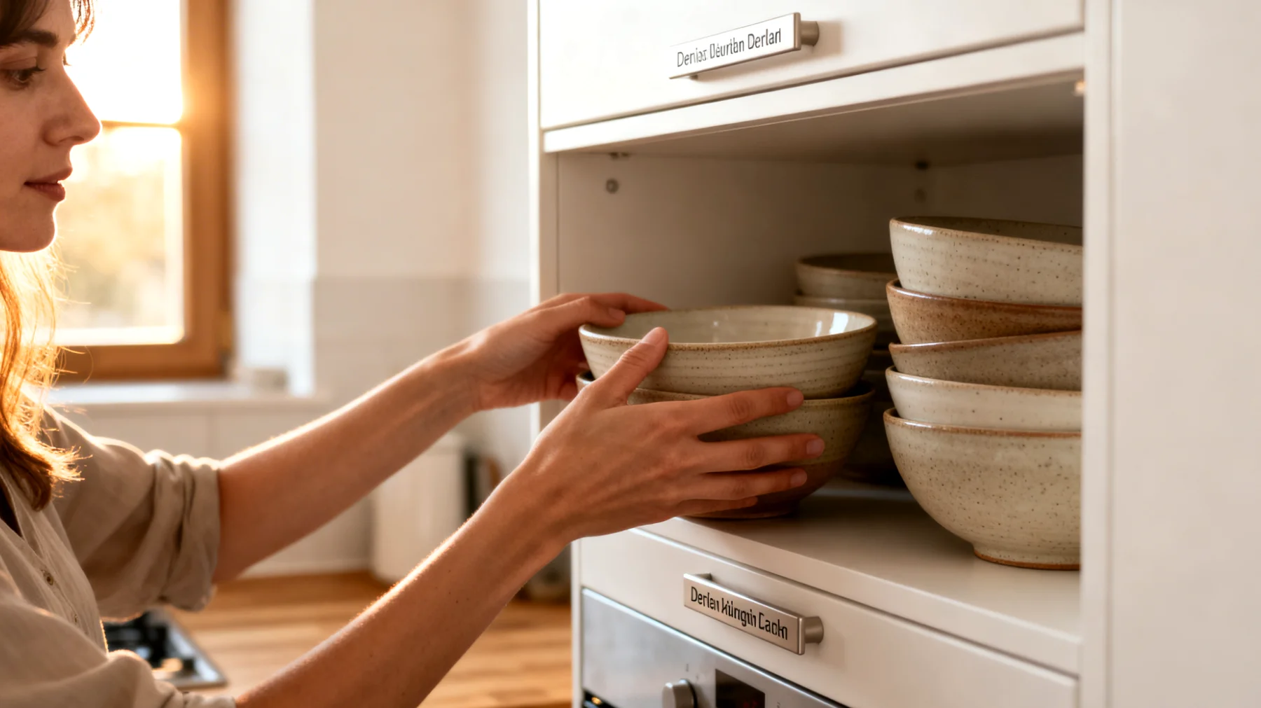 Die Zone B, die Sekundärreichweite, liegt etwas höher oder tiefer – in Fächern, die mit einer zusätzlichen Bewegung erreichbar sind. Hier finden wöchentlich genutzte Schüsseln ihren Platz: die große Salatschüssel, die hitzebeständige Schüssel für besondere Zubereitungen, eventuell eine zusätzliche Servierschale. Diese Zone dient als Puffer zwischen Alltag und Sonderanlässen.