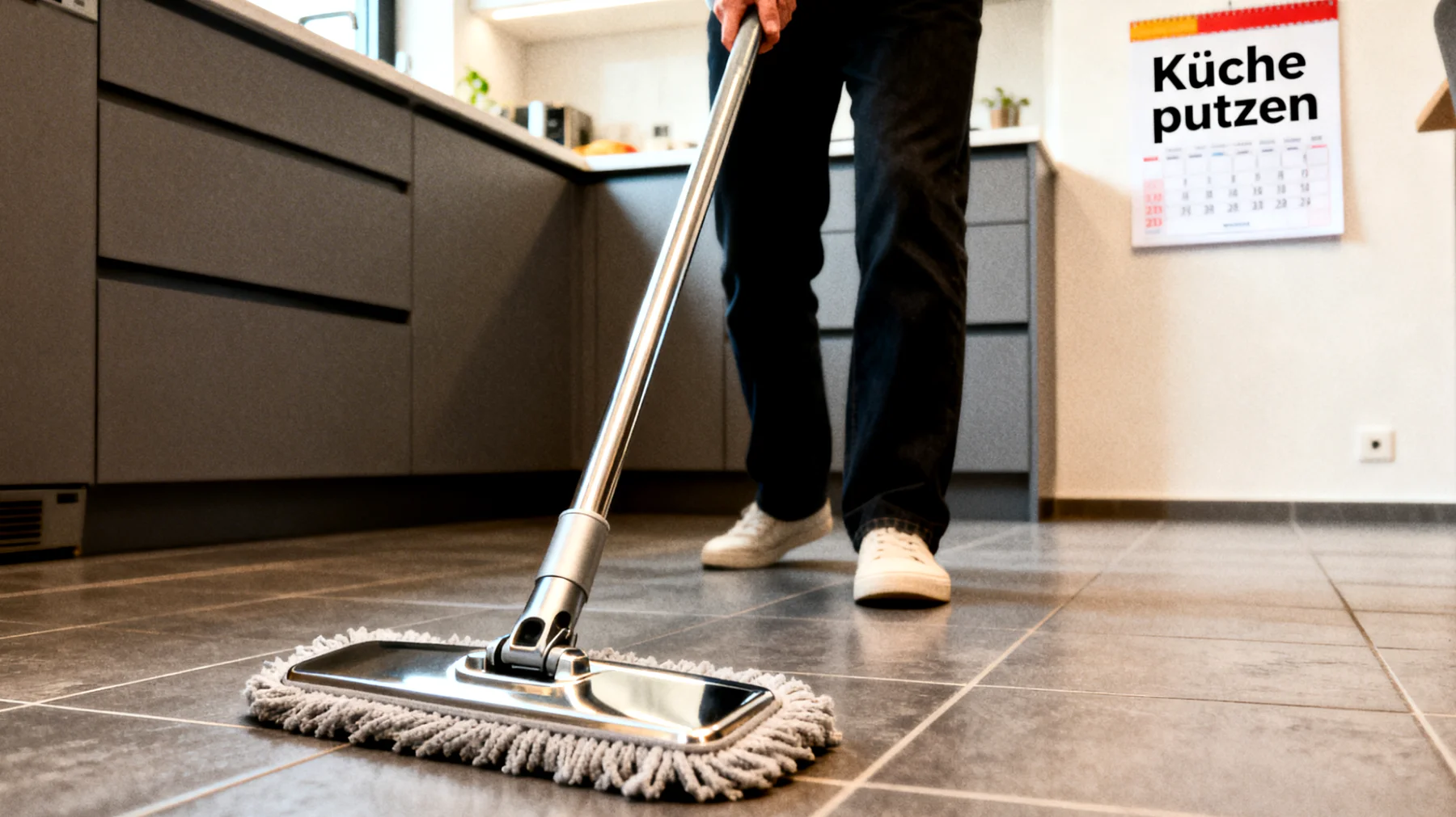 Ein farblich abgestimmter Mopp – silberner Stiel, sandfarbenes Pad, kleiner Akzent in Türkis – vermittelt Ausgewogenheit und Funktion zugleich. Solche Kombinationen beruhigen das Auge, ohne steril zu wirken. Sie vermeiden, dass der Hausarbeit ein technischer, kalter Charakter anhaftet.